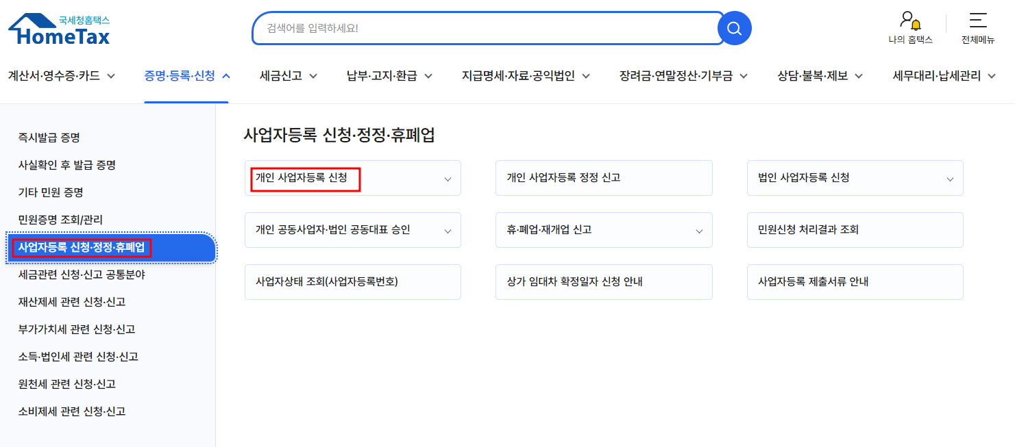 2.상단 메뉴에서 증명/등록/신청 → 사업자등록 신청 선택